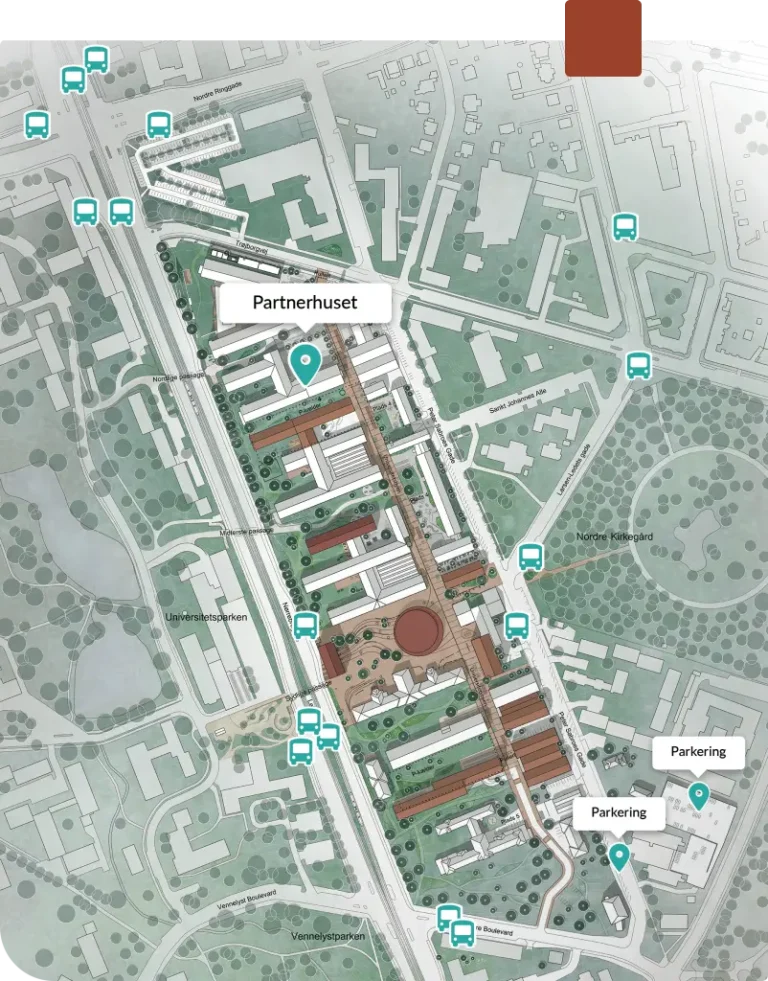Partnerhusets unikke placering i Universitetsbyen i Aarhus giver nem adgang til samarbejde i forskningsmiljøet, hvor også iværksættere og studentermiljøet er stærkt repræsenteret.